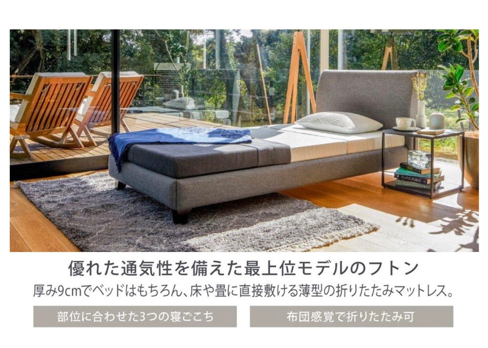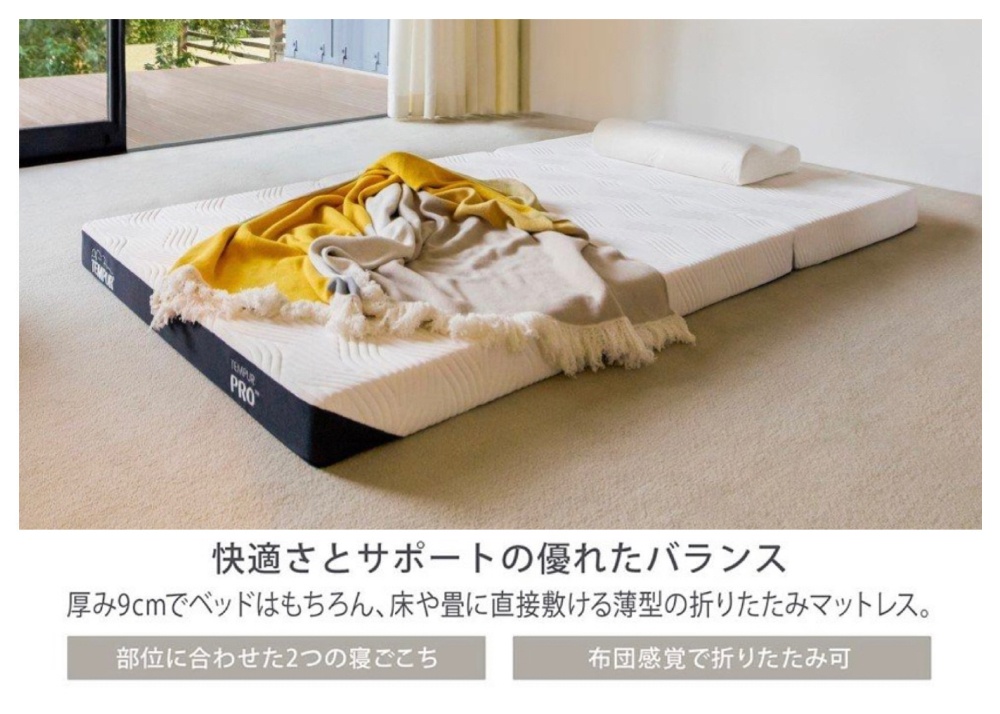 三つ折りできる薄型マットレステンピュールアドバンスト素材使用部位に合わせた2つのかたさ厚さ9cm5年保証税込価格・送料無料Sサイズ………104,500円SDサイズ……121,000円Dサイズ………137,500円〜〜〜〜【セール割引対象品】〜〜〜〜セール価格はお問合せフォームからお問合せください最安値希望の場合は来店申込みのうえ店頭にてご確認ください
