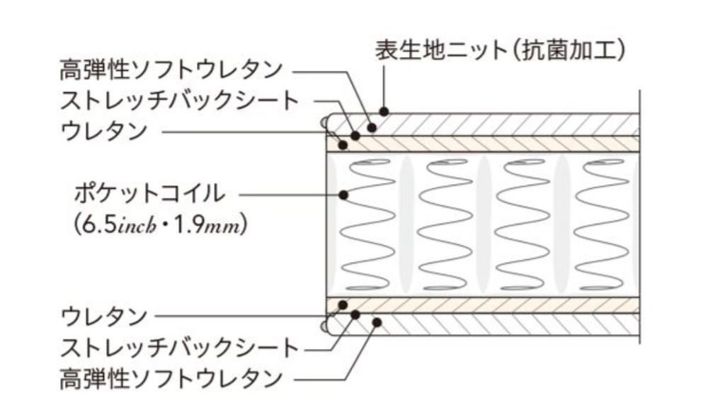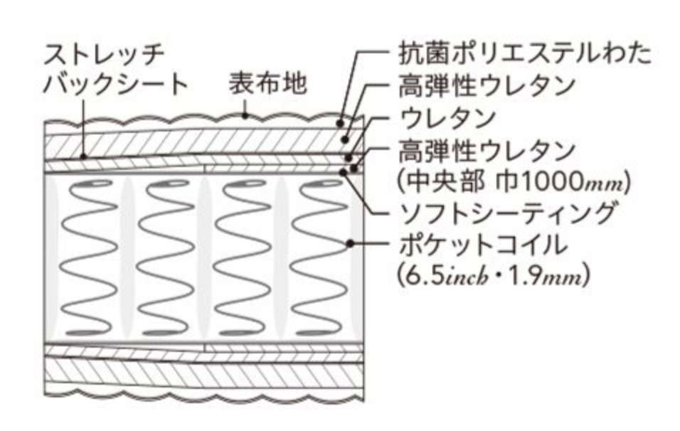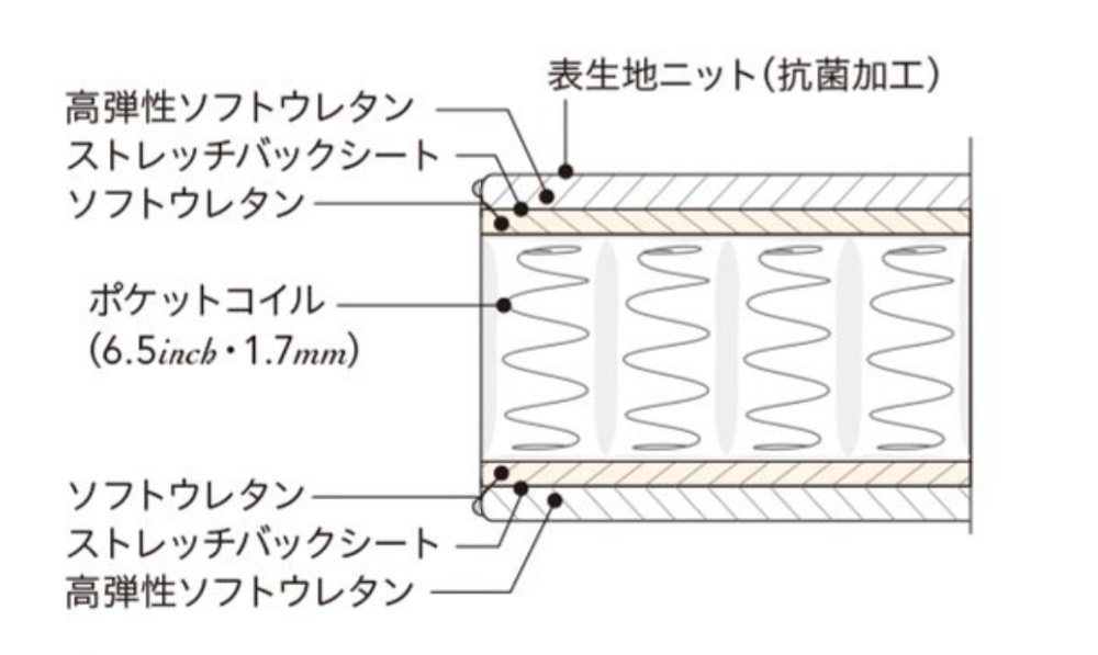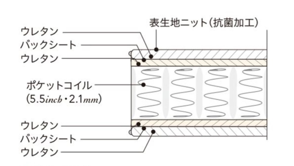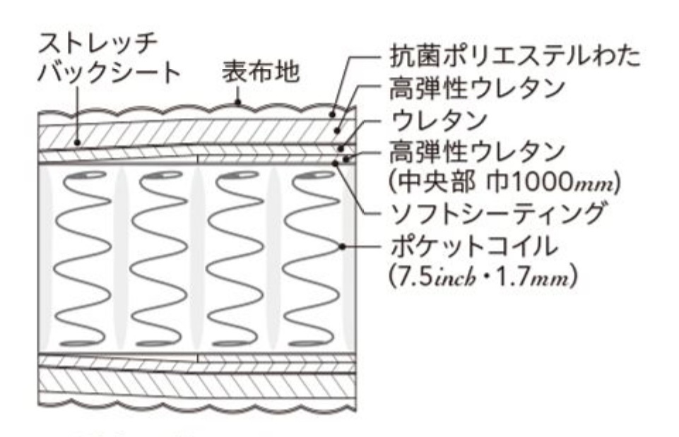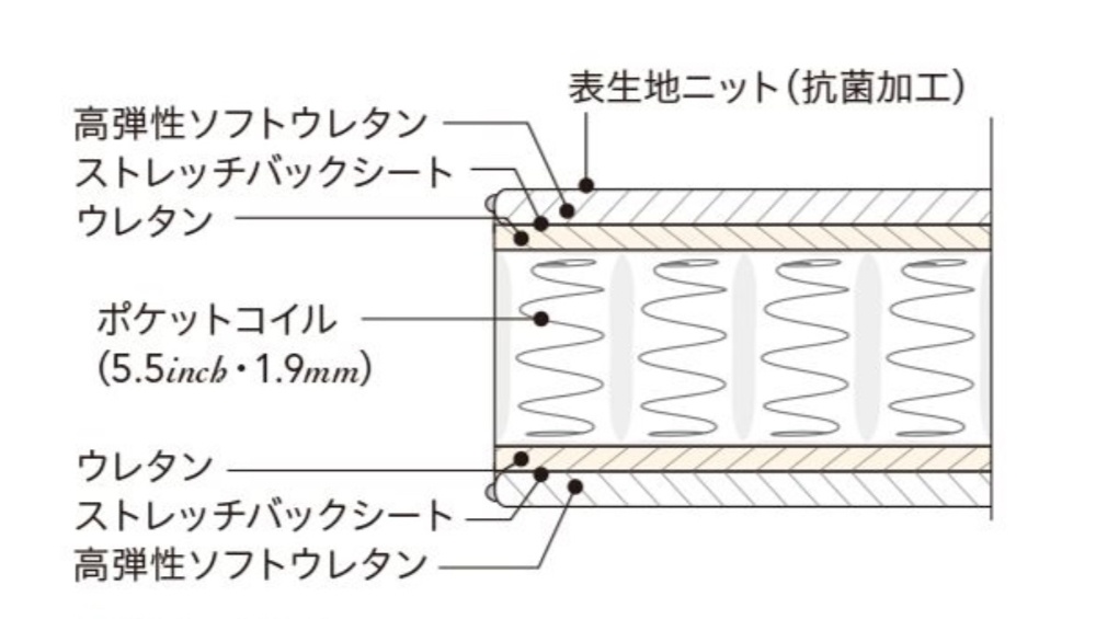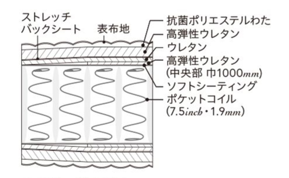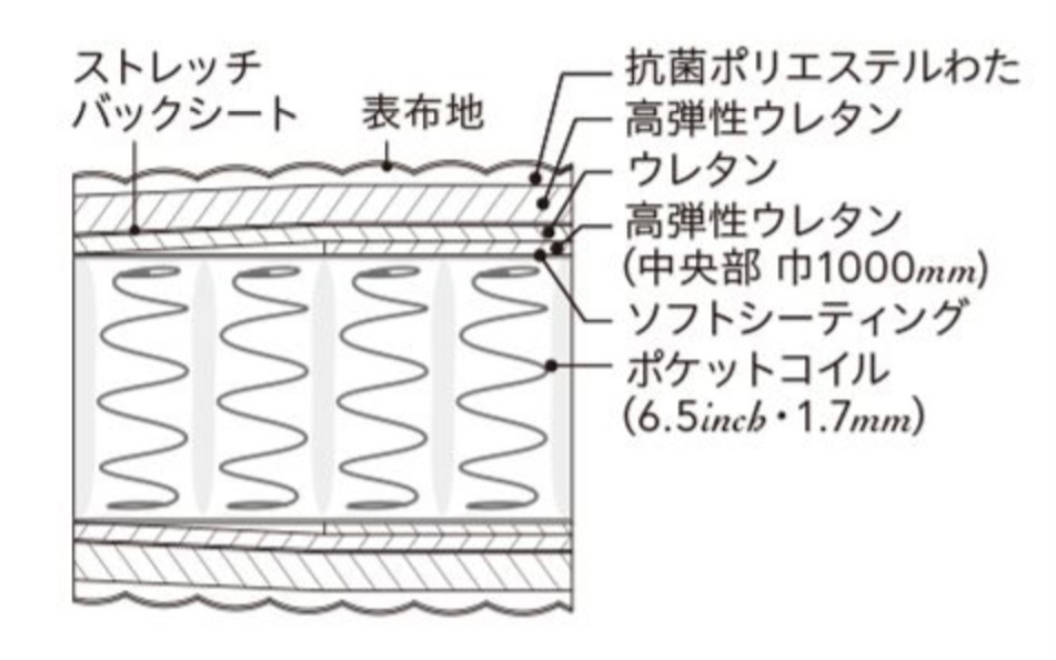 5.5インチポケットコイル(線径1.7mm)と4インチポケットコイル(線径1.2mm)を重ねた「コイルonコイル」構造です。