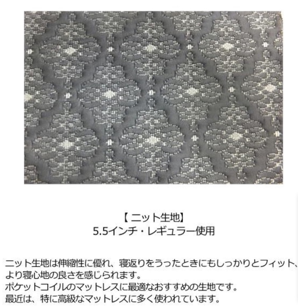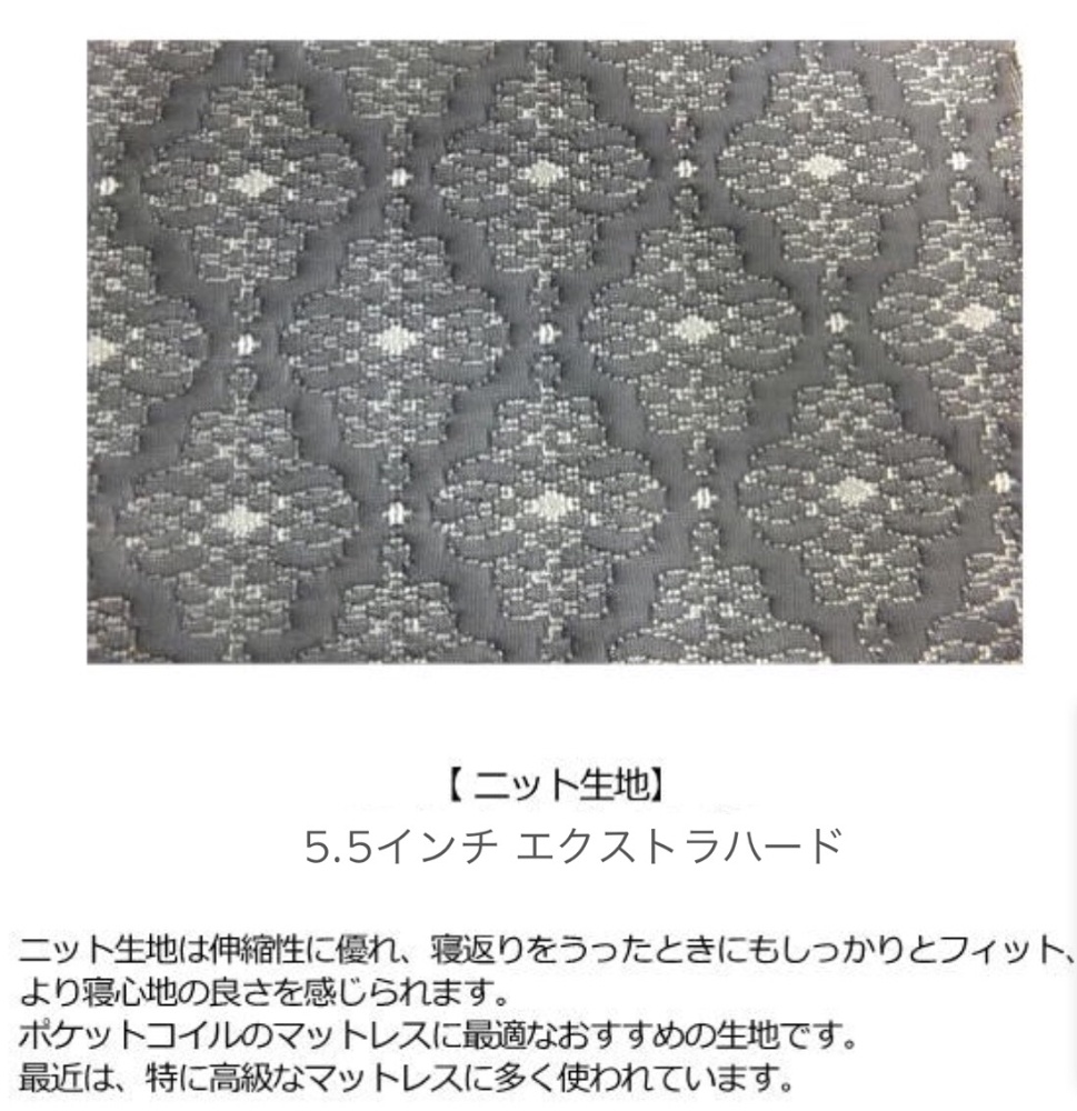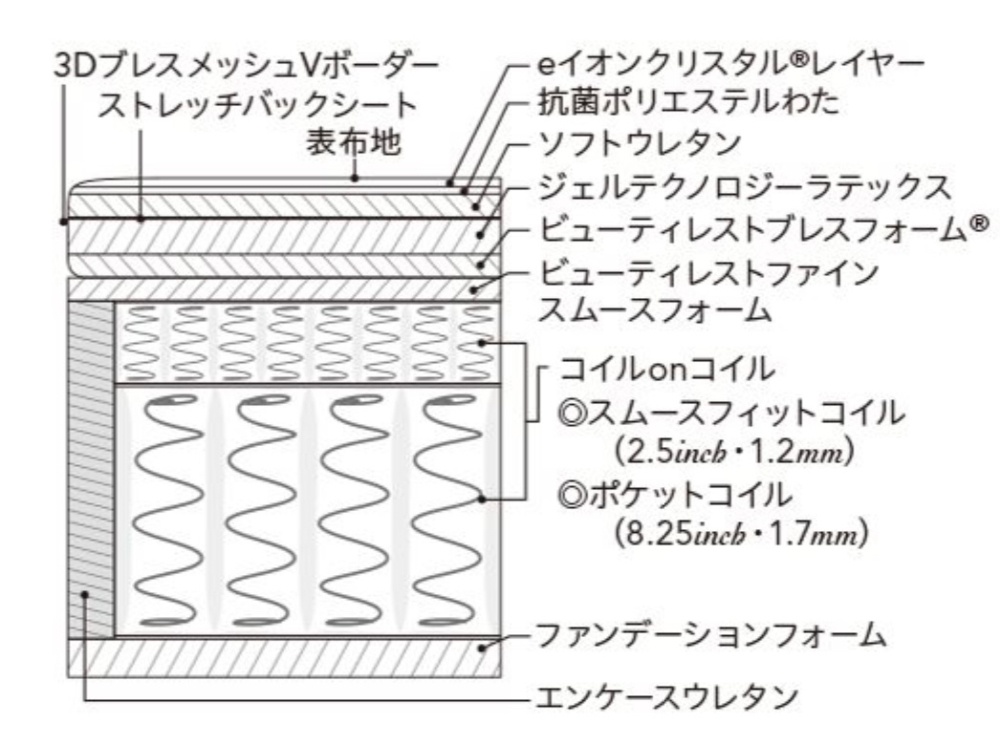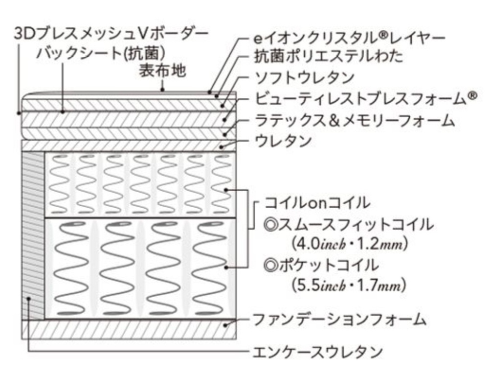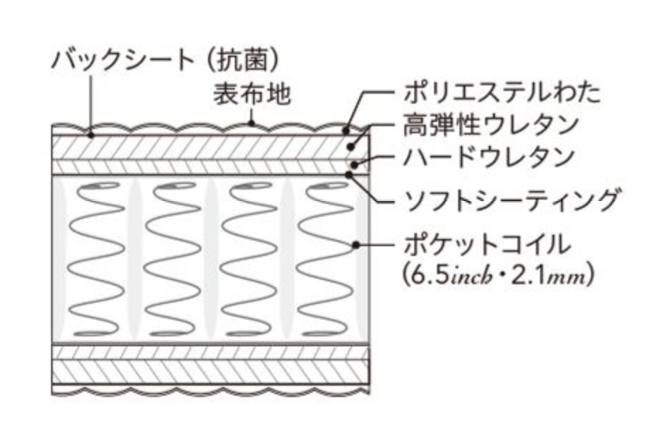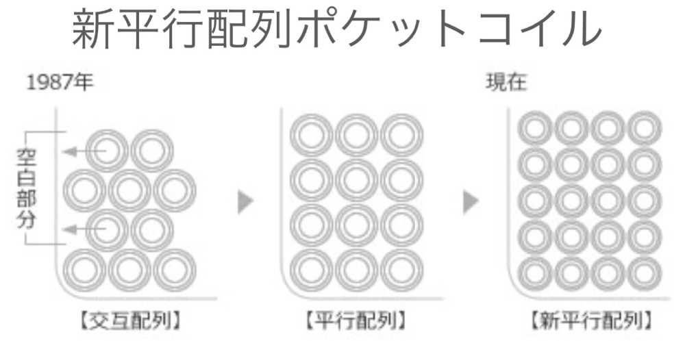 5.5インチポケットコイル(線径1.7mm)と4インチポケットコイル(線径1.2mm)を重ねた「コイルonコイル」構造です。