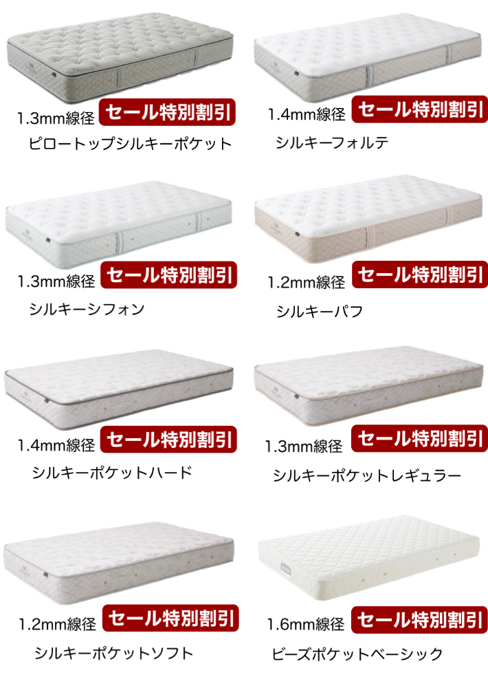 日本で初めて1926年創業の日本ベッドは、90年の歴史があり、ただひたすらに良い寝心地を追求してきました。湿気が多い環境、寝心地の嗜好、ふとんからベッドへの移行。日本ベッドのマットレスには、そんな本気が込められています。シルキーポケットマットレスは、1200個ものコイルで、きめ細かく体をサポート。まさに眠りの中に沈み込むような、とろけるような「絹」の寝心地です。