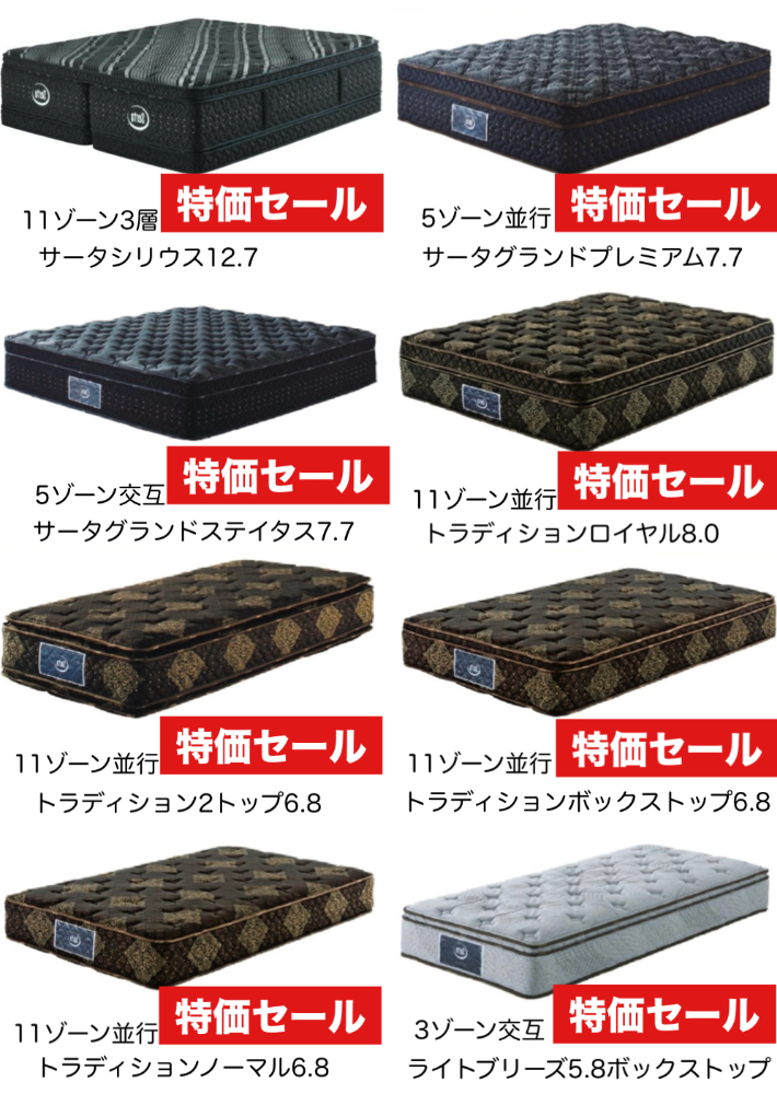 サータベッドマットレス全アイテム全サイズが特別割引でお買い求めいただけるサータベッド大特価セールがソメイユ流山ショールームにて開催