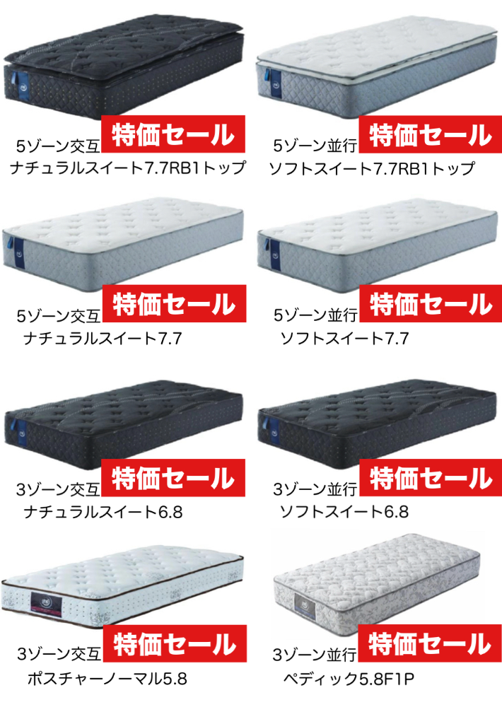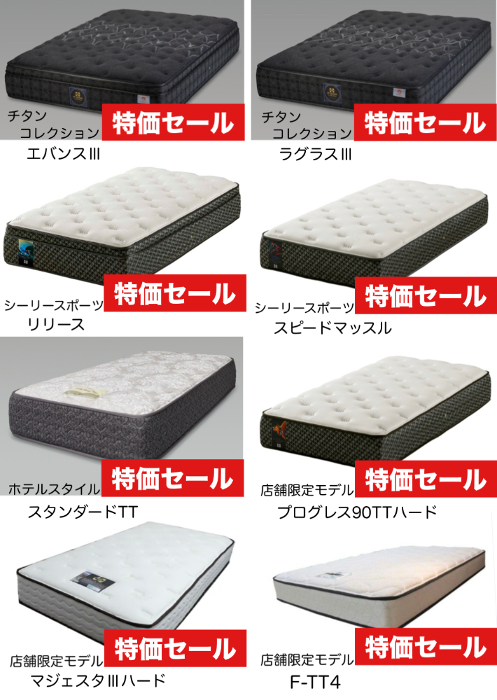 | 取扱ブランド | シモンズベッド サータベッド シーリーベッド テンピュール スランバーランド フランスベッド 日本ベッド 東京ベッド ドリームベッド カリモクベッド マニフレックス |